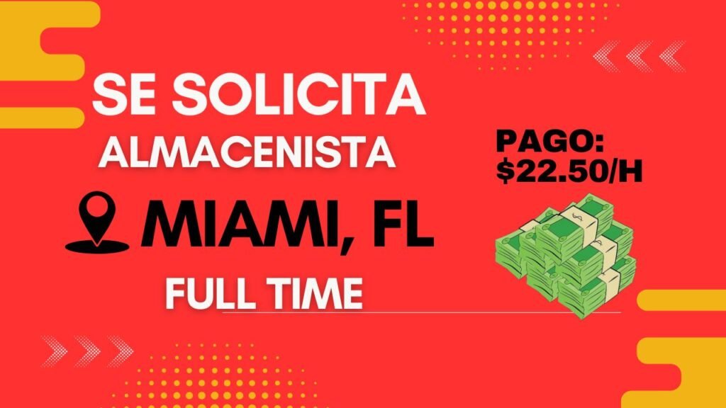 El puesto de bodeguero en Miami requiere disponibilidad de lunes a viernes de 9:00 am a 5:00 pm y ofrece una paga de $22.50 por hora, dependiendo de la experiencia del candidato.